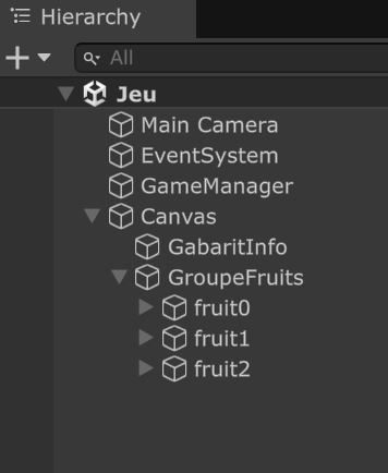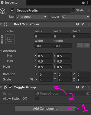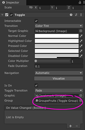 Ensuite, on associera à chacun des Toggles du groupe le gameObject parent (GroupeFruits) dans leur champ "Group"